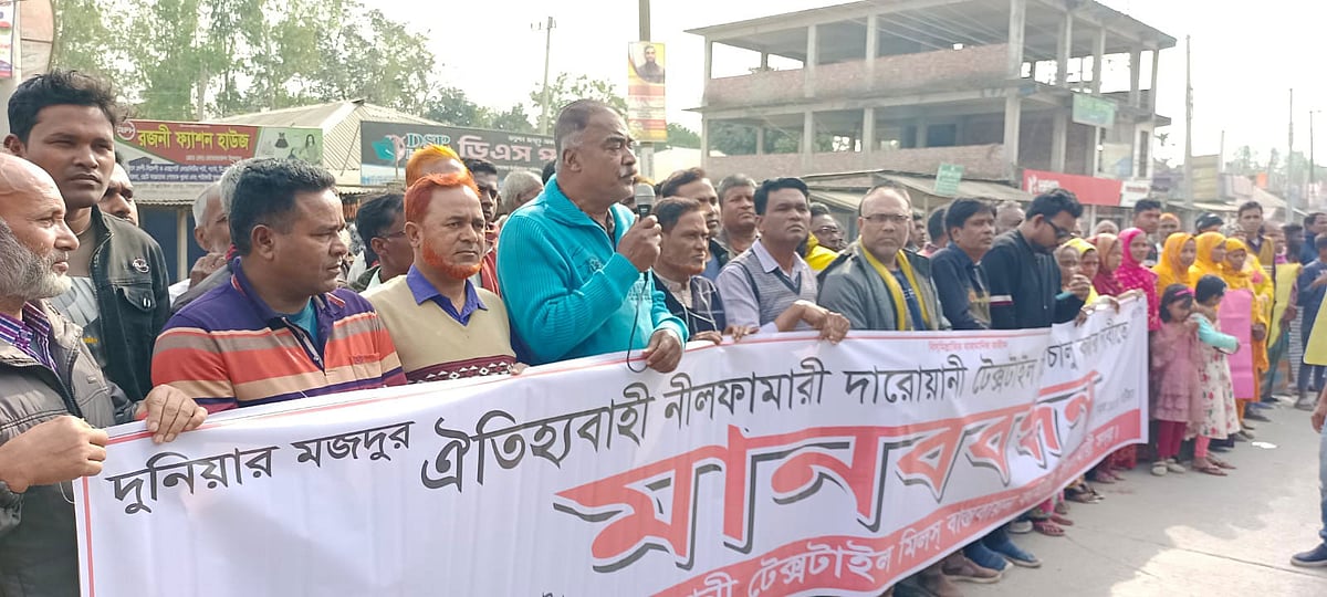 নীলফামারীর বন্ধ থাকা দারোয়ানী সুতাকল পুনরায় চালুর দাবিতে মানববন্ধন ও সমাবেশ কর্মসূচি পালিত হয়েছে। আজ সোমবার দুপুরে সুতাকলটির সামনের সড়কে আয়োজিত এই কর্মসূচিতে বিভিন্ন শ্রেণি–পেশার মানুষ অংশ নেন।