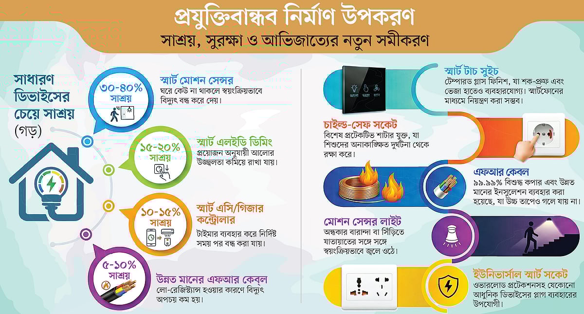 একসময় ‘ঘর’ মানে ছিল কেবল ইট-পাথরের দেয়াল আর মাথার ওপর একটি ছাদ। কিন্তু সময়ের পরিক্রমায় মানুষের জীবনযাত্রায় এসেছে আমূল পরিবর্তন। এখন ঘর শুধু থাকার জায়গা নয়; বরং আধুনিক রুচি, নিরাপত্তা ও স্বাচ্ছন্দ্যের এক অনন্য সংমিশ্রণ। আধুনিক নির্মাণে এখন শুধু সুন্দর ঘর নয়, প্রয়োজন ‘বুদ্ধিমান’ বা ‘স্মার্ট’ ঘর। উন্নত মানের কেব্ল, স্মার্ট সুইচ, এনার্জি সেভিং লাইট, শৈল্পিক টাইলস আর নতুন প্রযুক্তির গ্লাসের ছোঁয়ায় বদলে যাচ্ছে দেশের আবাসনচিত্র। নগর ছাড়িয়ে এই আধুনিকতার ছোঁয়া এখন পৌঁছে গেছে মফস্সলের অলিগলিতেও।