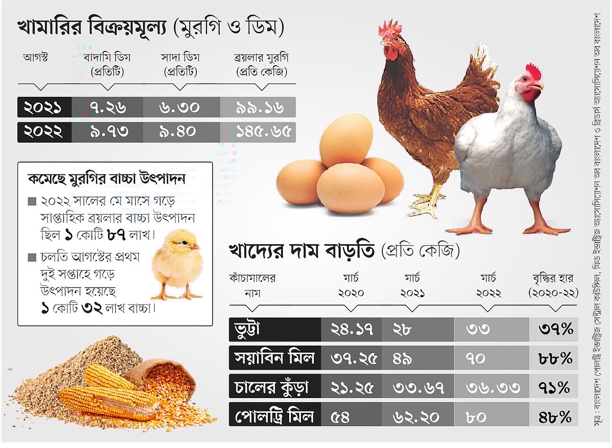 বাংলাদেশ পোলট্রি ইন্ডাস্ট্রিজ সেন্ট্রাল কাউন্সিলের (বিপিআইসিসি) তথ্য বলছে, পোলট্রিজাত পণ্য, মাছ ও গবাদিপশু উৎপাদনে ব্যবহৃত ১৬ ধরনের কাঁচামালের দাম ২০২০ সালের মার্চ থেকে চলতি বছরের মার্চ মাস পর্যন্ত গড়ে ৬৩ শতাংশের মতো বেড়েছে। এর মধ্যে দুই ধরনের কাঁচামালে ১০০ শতাংশের ওপরে দাম বেড়েছে। আট ধরনের কাঁচামালের দাম বেড়েছে ৫০ শতাংশ বা তারও বেশি হারে। এরপর জ্বালানি তেলের দাম ও দেশব্যাপী লোডশেডিংয়ের প্রভাবে বিকল্প ব্যবস্থায় পোলট্রি উৎপাদন অব্যাহত রাখতে খামারিদের আরও বাড়তি খরচ গুনতে হচ্ছে। আগস্টে জ্বালানি তেলের মূল্যবৃদ্ধির কারণে পরিবহন ব্যয় আরেক দফা বেড়েছে। এতে সামগ্রিকভাবে চাপে পড়েছে পোলট্রিশিল্পে।