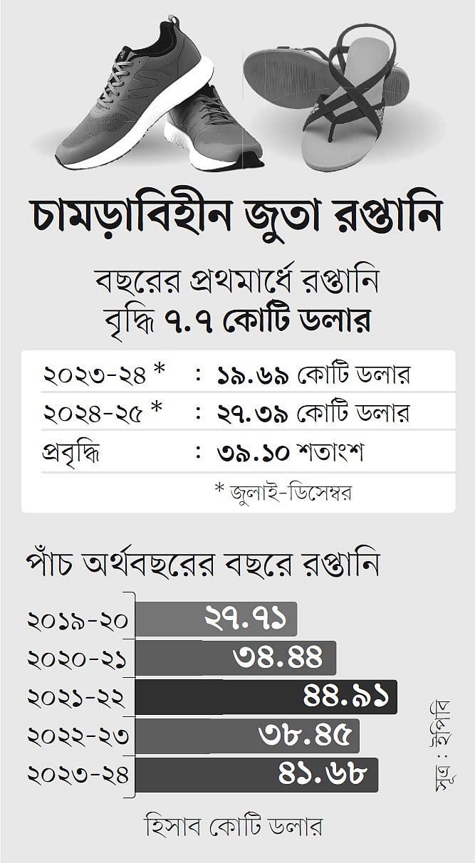 রপ্তানি উন্নয়ন ব্যুরোর (ইপিবি) তথ্যানুযায়ী, চলতি ২০২৪-২৫ অর্থবছরের প্রথম ছয় মাসে (জুলাই-ডিসেম্বর) ২৭ কোটি ৩৯ লাখ মার্কিন ডলারের চামড়াবিহীন জুতা রপ্তানি হয়েছে। এই রপ্তানি আগের অর্থবছরের একই সময়ের তুলনায় ৩৯ দশমিক ১০ শতাংশ বেশি। গত ২০২৩-২৪ অর্থবছরের প্রথমার্ধে ১৯ কোটি ৬৯ লাখ ডলারের চামড়াবিহীন জুতা রপ্তানি হয়েছিল।