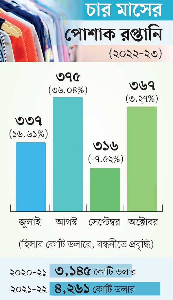 করোনার পর দ্রুত সময়ের মধ্যে বেশ ভালোভাবেই ঘুরে দাঁড়িয়েছিল তৈরি পোশাকের রপ্তানি। বিদায়ী ২০২১-২২ অর্থবছরে ৪ হাজার ২৬১ কোটি ডলারের পোশাক রপ্তানি হয়। এ সময় প্রবৃদ্ধি ছিল ৩৫ দশমিক ৪৭ শতাংশ। চলতি অর্থবছরের প্রথম দুই মাসেও রপ্তানি ভালো ছিল। তবে সেপ্টেম্বরে রপ্তানি সাড়ে সাত শতাংশ কমে যায়। ওই মাসে রপ্তানি হয় ৩১৬ কোটি ডলারের পোশাক। যদিও অক্টোবরে পোশাক রপ্তানিতে ৩ দশমিক ২৭ শতাংশ প্রবৃদ্ধি হয়েছে।