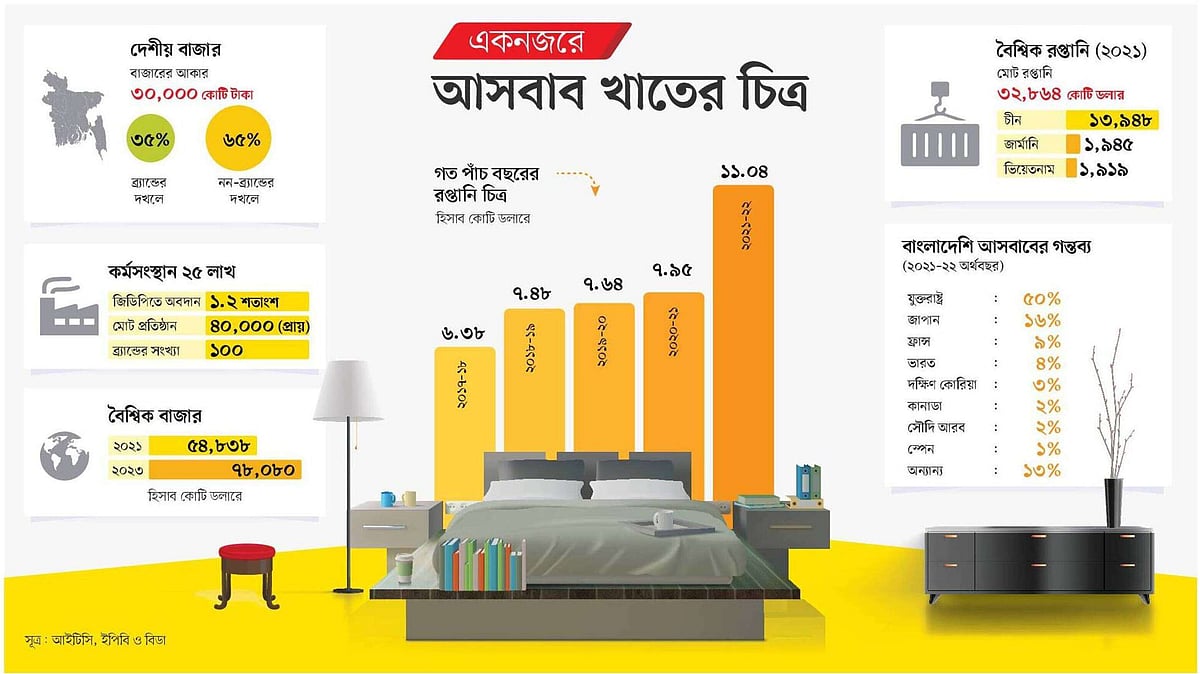 জানা যায়, বর্তমানে দেশে আসবাবের বাজার ৩০ হাজার কোটি টাকার। তার মধ্যে ৩৫ শতাংশ ব্র্যান্ডের দখলে। বাকিটা নন-ব্র্যান্ডেড প্রতিষ্ঠানের হাতে। দেশে ছোট-বড় মিলিয়ে বর্তমানে আসবাব প্রস্তুতকারক প্রতিষ্ঠানের সংখ্যা প্রায় ৪০ হাজার। তার মধ্যে স্বীকৃত ব্র্যান্ড আছে ১০০টির কাছাকাছি। আর এই খাতে কাজ করেন ২০-২৫ লাখ মানুষ।