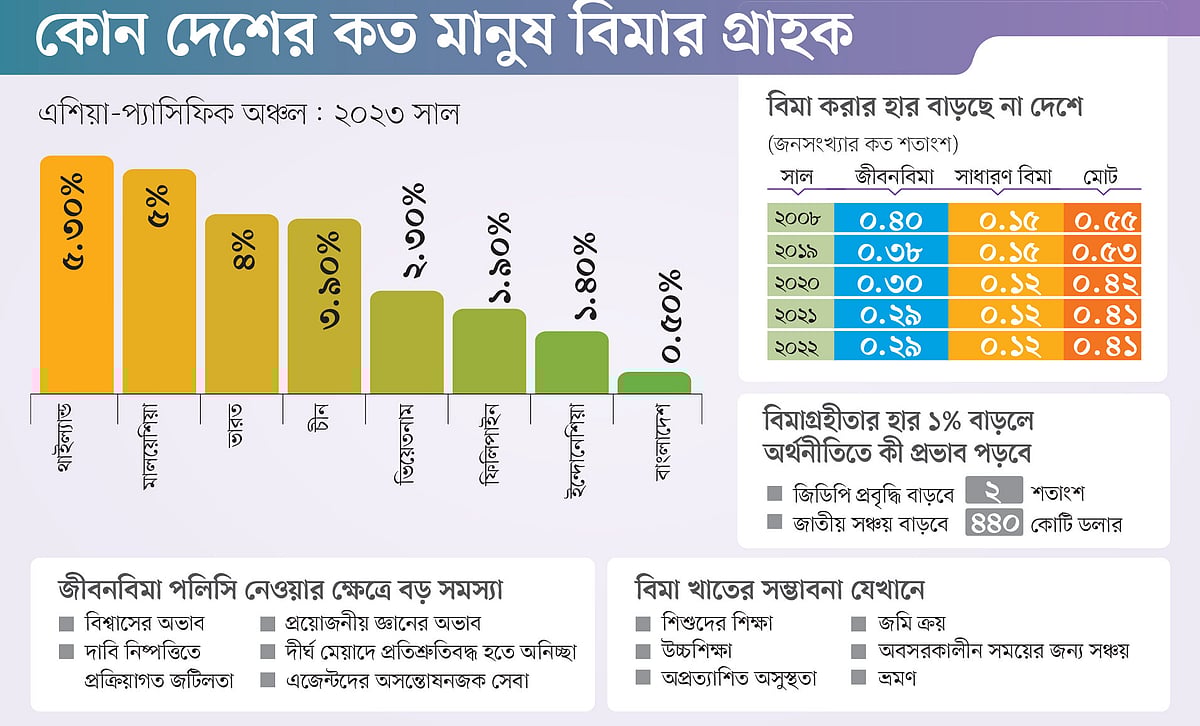 প্রতিবেদন মতে, দেশে জীবনবিমার গ্রাহক বাড়ছে না। ২০০৮ সালে দেশের মোট জনসংখ্যার মধ্যে জীবনবিমার গ্রাহক ছিলেন দশমিক ৪০ শতাংশ। ২০১৯ সালে সেটি কমে দশমিক ৩৮ শতাংশ হয়। ২০২২ সালে সেটি আরও কমে দশমিক ২২ শতাংশে নেমে যায়। একইভাবে সাধারণ বিমা গ্রাহকের সংখ্যাও কমেছে। অথচ বিমার গ্রাহক ১ শতাংশ বাড়লে দেশের জিডিপিতে ২ শতাংশের মতো প্রবৃদ্ধি হয়।