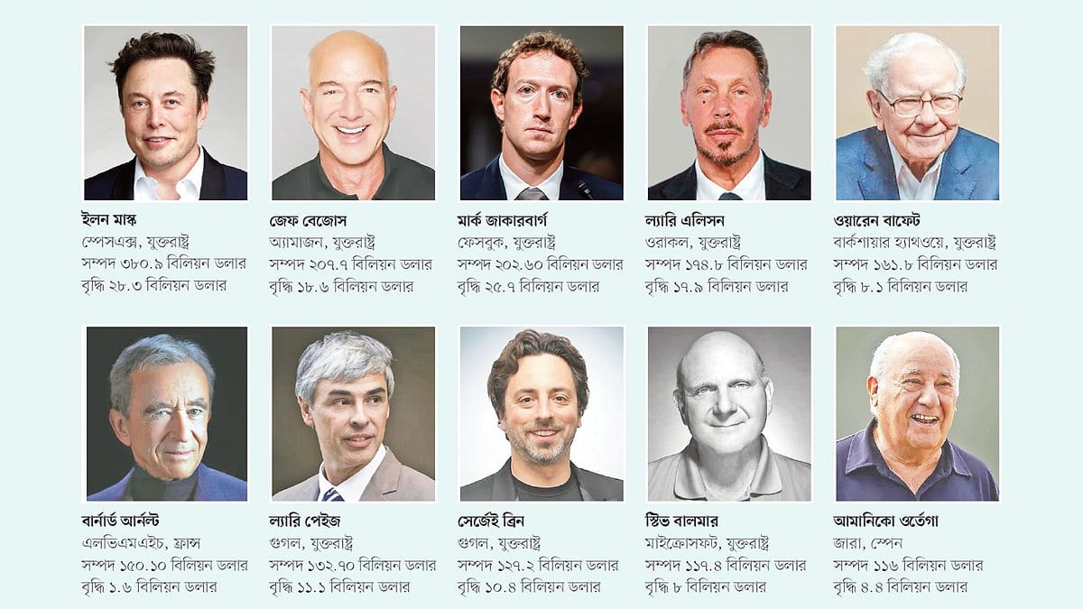 যুক্তরাষ্ট্রের বিশ্বখ্যাত ফোর্বস ম্যাগাজিনের তথ্যানুসারে, গতকাল বৃহস্পতিবার বিশ্বের শীর্ষ ১০ অতিধনীর প্রত্যেকেরই সম্পদের মূল্য বেড়েছে। সব মিলিয়ে তাঁদের নিট সম্পদমূল্য বেড়েছে ১৩১ দশমিক ৫ বিলিয়ন বা ১৩ হাজার ১৫৫ কোটি মার্কিন ডলার। সম্পদমূল্য বৃদ্ধির নিরিখে সবার ওপর আছেন বিশ্বের শীর্ষ ধনী ও মার্কিন প্রেসিডেন্ট ডোনাল্ড ট্রাম্পের বিশেষ সহযোগী ইলন মাস্ক। তাঁর সম্পদের দাম বেড়েছে ২৮ দশমিক ৩ বিলিয়ন বা ২ হাজার ৮৩০ কোটি ডলার। এতে তাঁর সম্পদমূল্য বেড়ে দাঁড়িয়েছে ৩৮০ দশমিক ৯ বিলিয়ন বা ৩৮ হাজার ৯০ কোটি ডলার। প্রসঙ্গত, এক বিলিয়নে ১০০ কোটি।