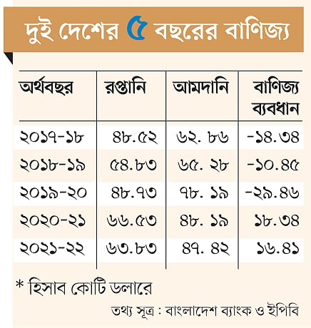 দ্বিপক্ষীয় বাণিজ্য এক দশক আগেও ছিল ৭০ কোটি ডলারের। ২০১৭-১৮ অর্থবছর থেকে তা শতকোটি ডলারের বেশি থাকছে।