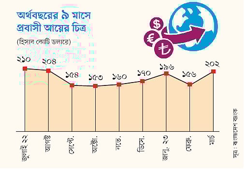 সদ্য সমাপ্ত মার্চ মাসে প্রবাসী আয় বেড়ে ২০০ কোটি ডলার ছাড়িয়েছে, অন্যদিকে রপ্তানি আয় কমে ৪৬৪ কোটি ডলারে নেমে এসেছে।