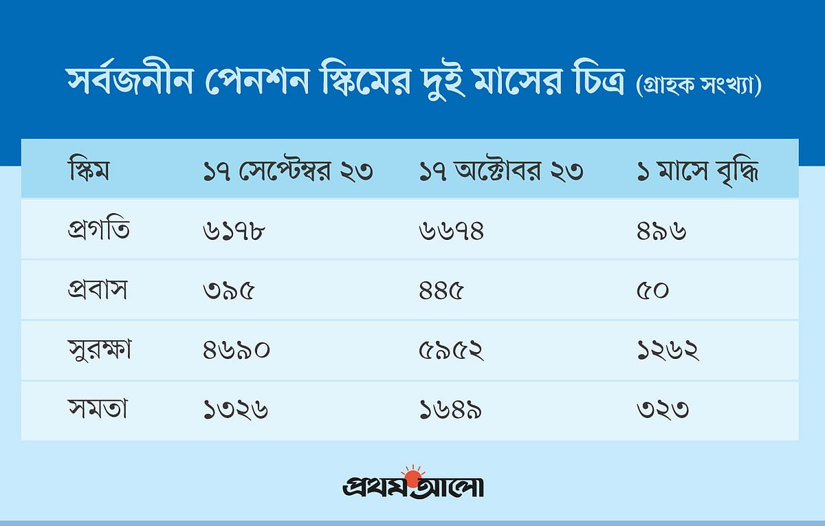 পেনশন কর্তৃপক্ষ সূত্রে জানা গেছে, চার কর্মসূচির মধ্যে সবচেয়ে বেশি সাড়া পাওয়া গেছে প্রগতি কর্মসূচিতে। বেসরকারি চাকরিজীবীদের এ কর্মসূচির জন্য মোট ৬ হাজার ৬৭৪ জন চাঁদা পরিশোধ করেছেন। গত মাসে দিয়েছিলেন ৬ হাজার ১৭৮ জন।