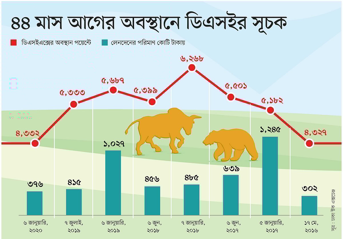 >গত দুই দিনে ঢাকার বাজারের প্রধান সূচকটি প্রায় ৩ শতাংশ বা ১২৭ পয়েন্ট কমে ৪৪ মাস আগের অবস্থানে ফিরে গেছে।