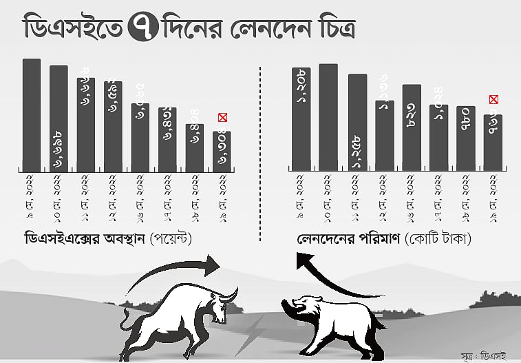 এদিকে বড় ধরনের দরপতন চলছে শেয়ারবাজারে। তারই অংশ হিসেবে মাত্র সাত কার্যদিবসে দেশের প্রধান শেয়ারবাজার ঢাকা স্টক এক্সচেঞ্জের (ডিএসই) প্রধান সূচক ডিএসইএক্স সাড়ে ৬ শতাংশ বা ৪৪০ পয়েন্ট কমে গেছে। আর লেনদেন কমেছে প্রায় ৪৫ শতাংশ। কয়েক দিনের বড় ধরনের দরপতনে এ অবস্থা দাঁড়িয়েছে শেয়ারবাজারের। আর তার বড় কারণ ক্রেতাসংকট।