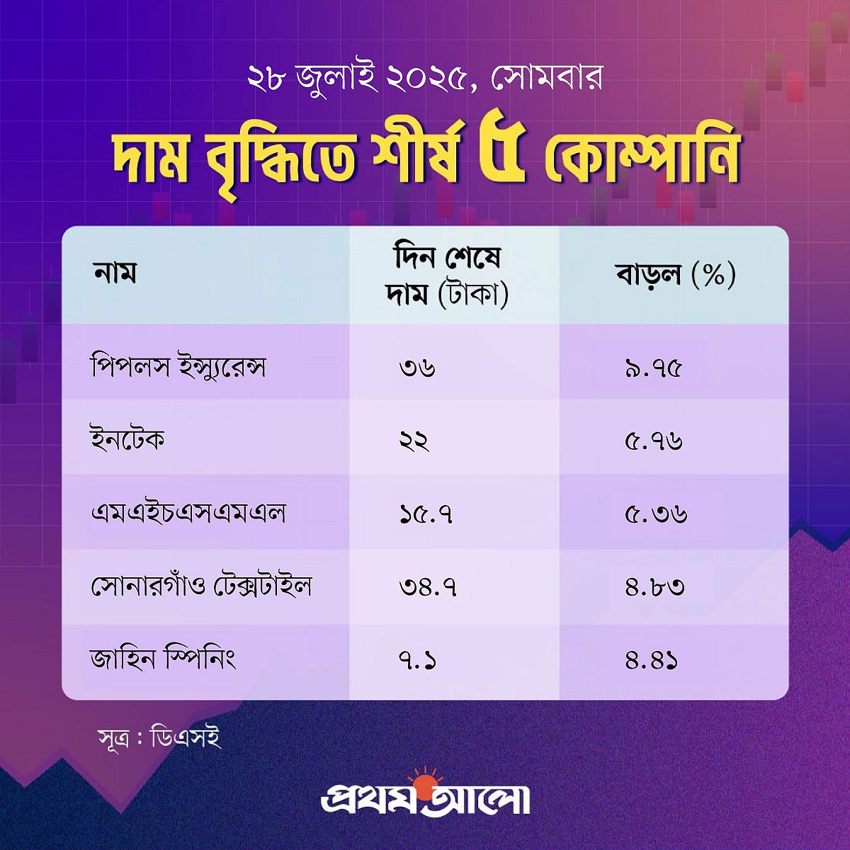 আজ মূল্যবৃদ্ধির শীর্ষে আছে পিপলস ইনস্যুরেন্স। আজ এই শেয়ারের দাম বেড়েছে ৯ দশমিক ৭৫ শতাংশ বা ৩ দশমিক ২০ টাকা। গতকাল রোববার এই কোম্পানির শেয়ারের দাম ছিল ৩২ দশমিক ৮ টাকা। আজ দিন শেষে দাম বেড়ে হয়েছে ৩৬ টাকা। কোম্পানিটি ২০২৪ ও ২০২৩ সালে যথাক্রমে ১০ দশমিক ৫০ ও ১০ শতাংশ নগদ লভ্যাংশ দিয়েছে।