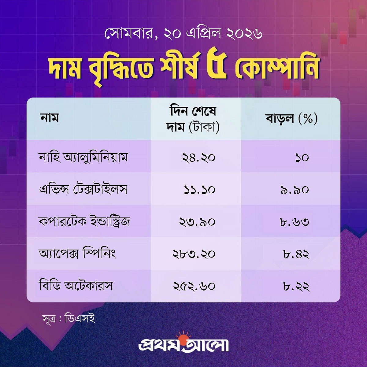আজ দিন শেষে দাম বেড়েছে ১২০টি কোম্পানির শেয়ারের। কমেছে ২০৭টির ও অপরিবর্তিত আছে ৬২টি কোম্পানির শেয়ারের দাম। দেখে নেওয়া যাক, আজ মূল্যবৃদ্ধির শীর্ষে আছে কোন কোম্পানিগুলো।