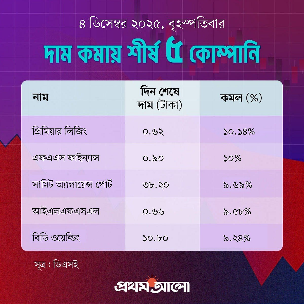 আজ দিন শেষে দাম বেড়েছে ৩৪টি কোম্পানির শেয়ারের। কমেছে ৩০৭টির ও অপরিবর্তিত আছে ৪৪টি কোম্পানির। ঢাকা স্টক এক্সচেঞ্জের ওয়েবসাইটের তথ্য অনুসারে, আজ মূল্যহ্রাসের শীর্ষে আছে প্রিমিয়ার লিজিং।