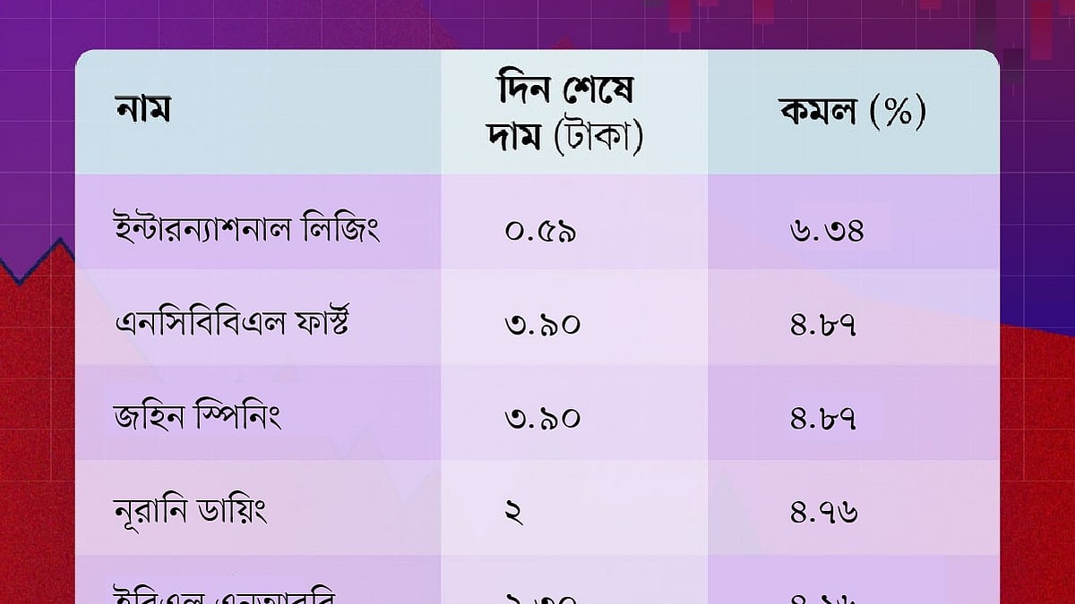 মূল্যহ্রাসের দিক থেকে আজ শীর্ষে আছে ইন্টারন্যাশনাল লিজিং। আজ এই শেয়ারের দাম কমেছে ৬ দশমিক ৩৪ শতাংশ। গতকাল এই শেয়ারের দাম ছিল ৬৩ পয়সা। আজ দাম কমে হয়েছে ৫৯ পয়সা।