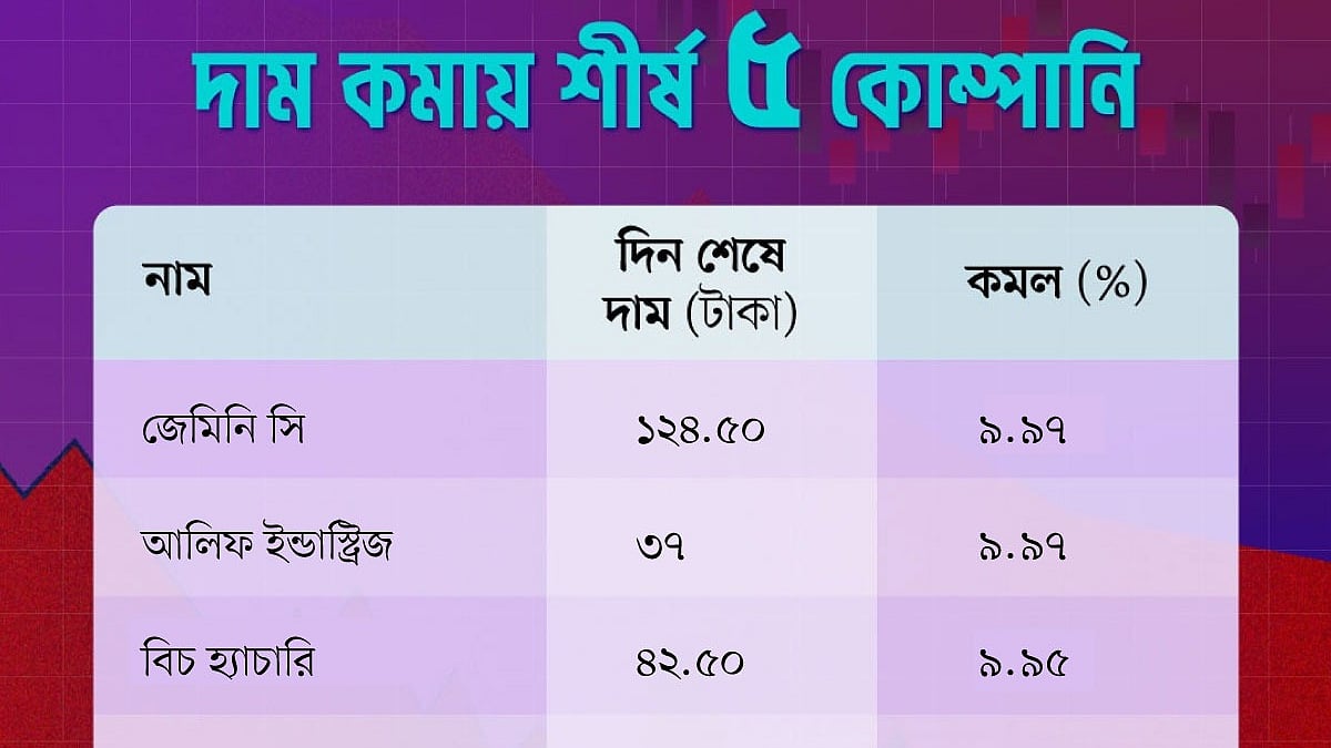 মূল্যহ্রাসের দিক থেকে আজ শীর্ষে আছে জেমিনি সি। আজ এই শেয়ারের দাম কমেছে ৯ দশমিক ৯৭ শতাংশ। গতকাল এই শেয়ারের দাম ছিল ১৩৮ টাকা ৩০ পয়সা। আজ দাম কমে হয়েছে ১২৪ টাকা ৫০ পয়সা।
