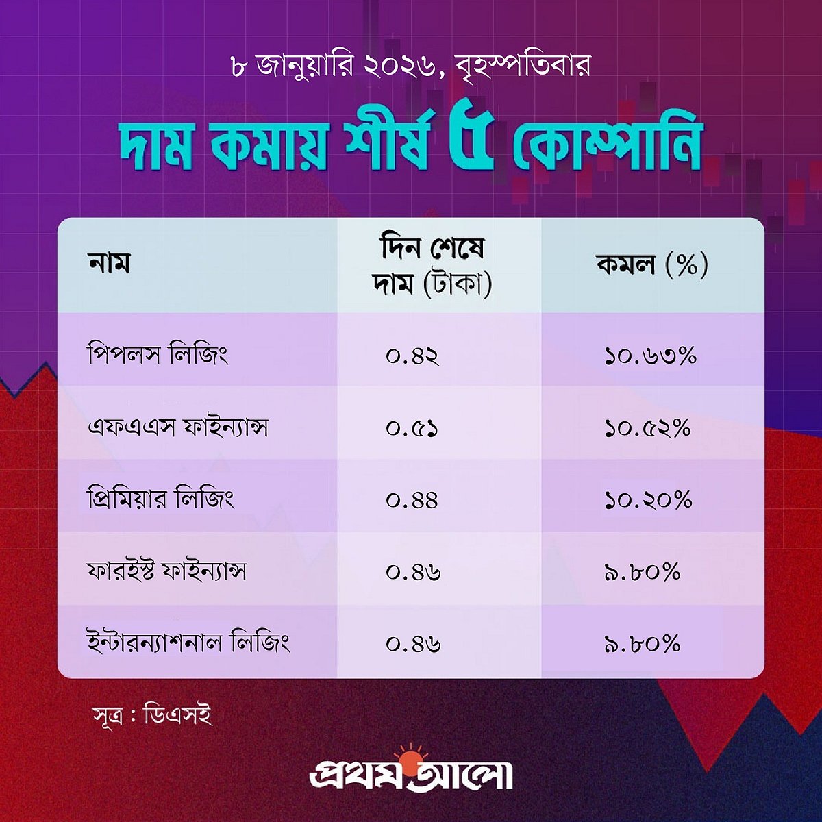 মূল্যহ্রাসের দিক থেকে আজ চতুর্থ স্থানে আছে ফারইস্ট ফাইন্যান্স। আজ এই শেয়ারের দাম কমেছে ৯ দশমিক ৮০ শতাংশ। গতকাল এই কোম্পানির শেয়ারের দাম ছিল ৫১ পয়সা। আজ দাম কমে হয়েছে ৪৬ পয়সা।