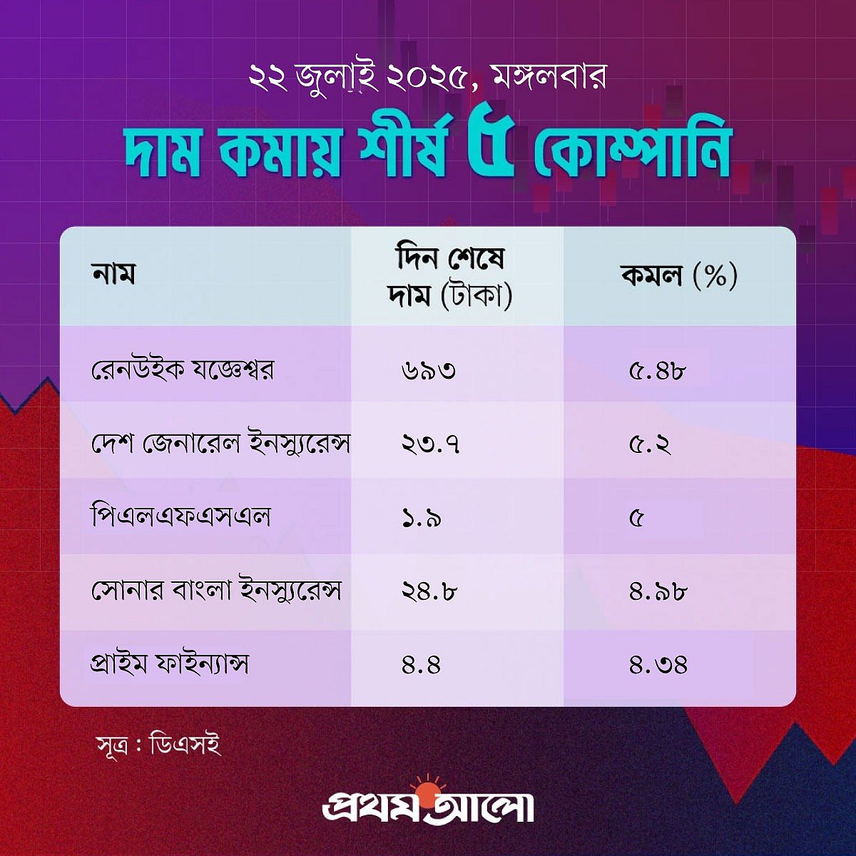 পঞ্চম স্থানে থাকা প্রাইম ফাইন্যান্সের দাম কমেছে ৪ দশমিক ৩৪ শতাংশ বা ২০ পয়সা। গতকাল দিন শেষে এই শেয়ারের দাম ছিল ৪ দশমিক ৬ টাকা। আজ দিন শেষে এর দাম হয়েছে ৪ দশমিক ৪ টাকা। এই কোম্পানি ২০১৯ সালে ২ শতাংশ ও ২০১৪ সালে ১২ দশমিক ৫০ শতাংশ নগদ লভ্যাংশ দিয়েছে।