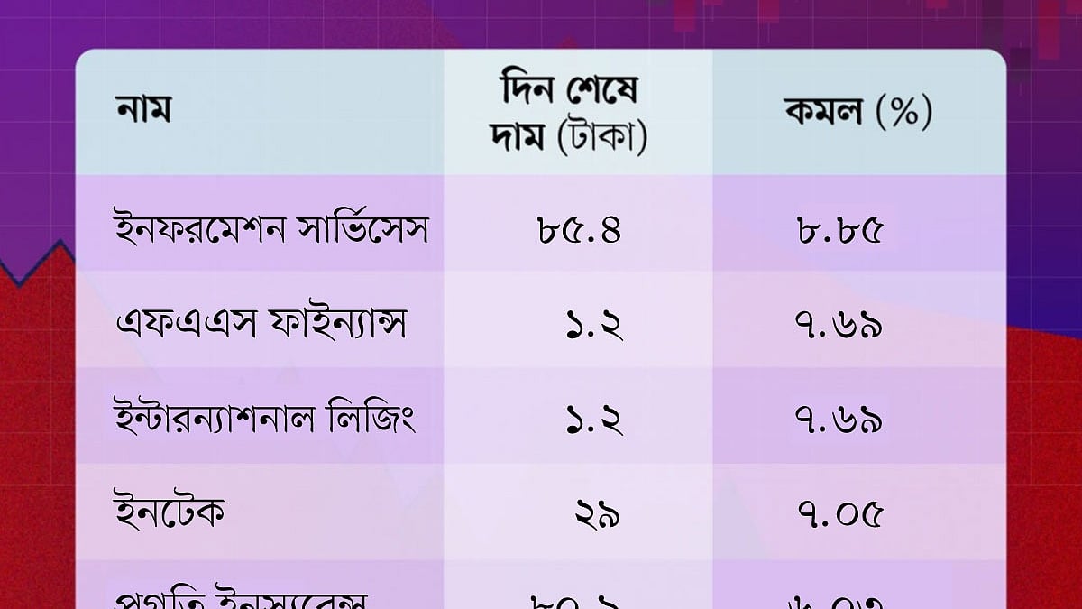 আজ মূল্যহ্রাসের শীর্ষে আছে ইনফরমেশন সার্ভিসেস নেটওয়ার্ক লিমিটেড। আজ এই কোম্পানির শেয়ারের দাম ৮ দশমিক ৮৫ শতাংশ কমে ৮৫ দশমিক ৪০ টাকায় নেমে এসেছে। গতকাল সোমবার এই শেয়ারের দাম ছিল ৯৩ দশমিক ৭০ টাকা।
