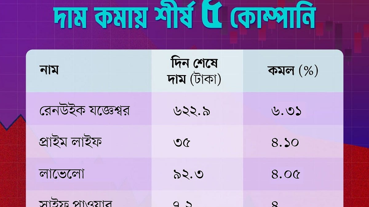 মূল্যহ্রাসের দিক থেকে আজ প্রথম স্থানে আছে রেনউইক যজ্ঞেশ্বর। আজ এই কোম্পানির শেয়ারের দাম কমেছে ৬ দশমিক ৩১ শতাংশ বা ৪২ টাকা। বৃহস্পতিবার দিন শেষে এই কোম্পানির শেয়ারের দাম ছিল ৬৬৪ দশমিক ৯ টাকা। আজ দাম কমে হয়েছে ৬২২ দশমিক ৯ টাকা। কোম্পানিটি ২০১৮ ও ২০১৭ সালে ১২ শতাংশ নগদ লভ্যাংশ দিয়েছে।