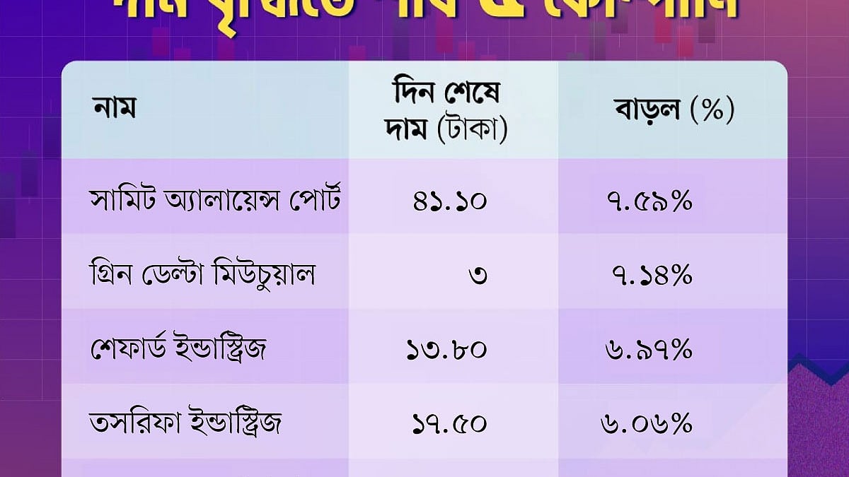 মূল্যবৃদ্ধির দিক থেকে আজ প্রথম স্থানে আছে সামিট অ্যালায়েন্স পোর্ট লিমিটেড। গত বৃহস্পতিবার এই শেয়ারের দাম ছিল ৩৮ টাকা ২০ পয়সা। আজ এই কোম্পানির শেয়ারের দাম বেড়ে হয়েছে ৪১ টাকা ১০ পয়সা। আজ দাম বেড়েছে ৭ দশমিক ৫৯ শতাংশ।