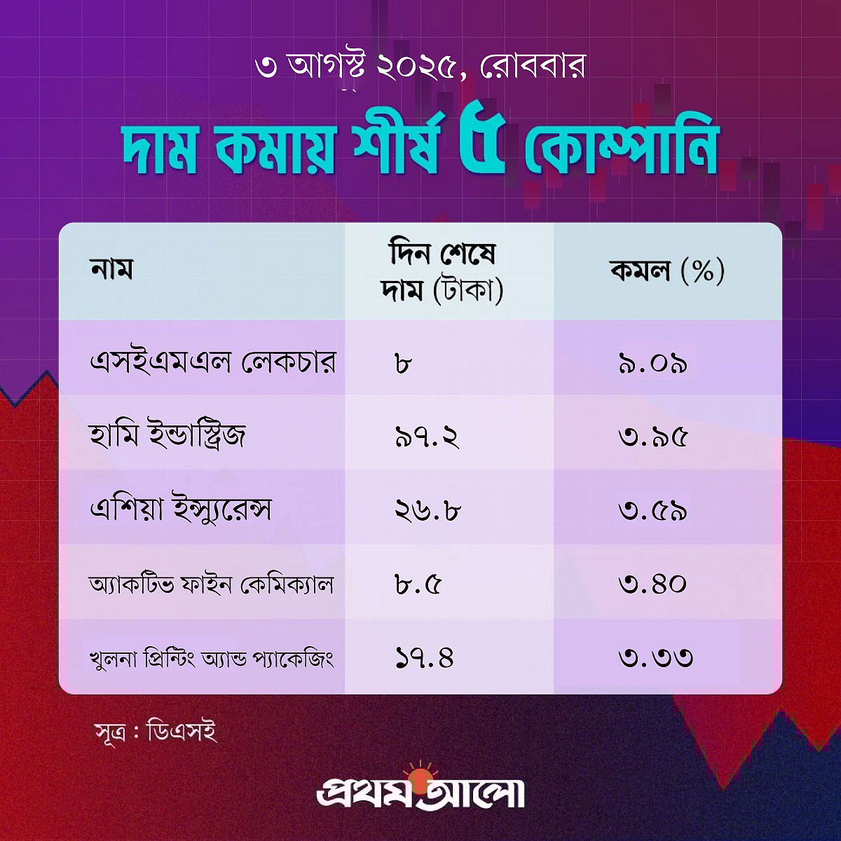 চতুর্থ স্থানে আছে অ্যাকটিভ ফাইন কেমিক্যাল। আজ এই কোম্পানির শেয়ারের দাম কমেছে ৩ দশমিক ৪০ শতাংশ বা ৩০ পয়সা। গত বৃহস্পতিবার দিন শেষে এই কোম্পানির শেয়ারের দাম ছিল ৮ দশমিক ৮ টাকা। আজ দিন শেষে দাম হয়েছে ৮ দশমিক ৫ টাকা।