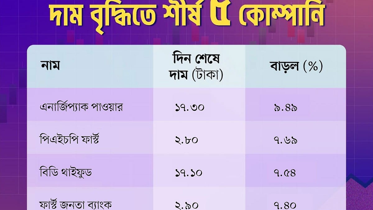 মূল্যবৃদ্ধির দিক থেকে আজ প্রথম স্থানে আছে এনার্জিপ্যাক পাওয়ার। গতকাল এই শেয়ারের দাম ছিল ১৫ টাকা ৮০ পয়সা। আজ এই কোম্পানির শেয়ারের দাম বেড়ে হয়েছে ১৭ টাকা ৩০ পয়সা। আজ দাম বেড়েছে ৯ দশমিক ৪৯ শতাংশ।