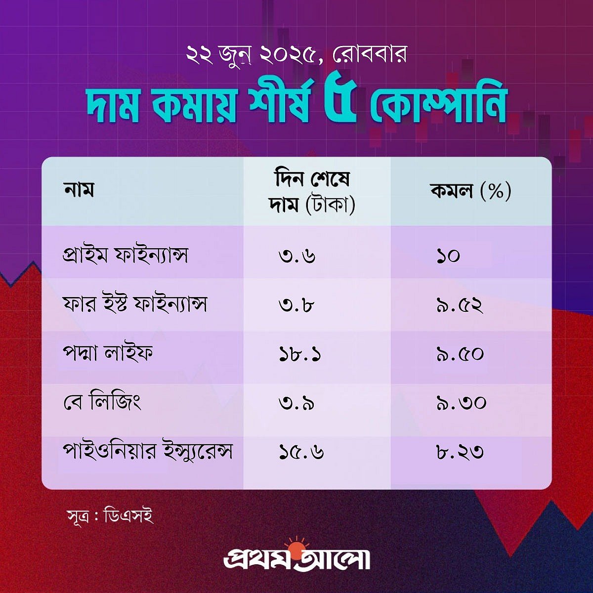 ডিএসইর ওয়েবসাইট সূত্রে দেখা যাচ্ছে, আজ সবচেয়ে বেশি দাম কমেছে প্রাইম ফাইন্যান্স কোম্পানি লিমিটেডের। কোম্পানিটির শেয়ারের দাম কমেছে ১০ শতাংশ। গত বৃহস্পতিবার দিন শেষে এই শেয়ারের দাম ছিল ৪ টাকা। আজ দিন শেষে এ কোম্পানির শেয়ারের দাম হয়েছে ৩ দশমিক ৬ টাকা। ২০১৯ সালে কোম্পানিটি ২ শতাংশ নগদ লভ্যাংশ দিয়েছে।