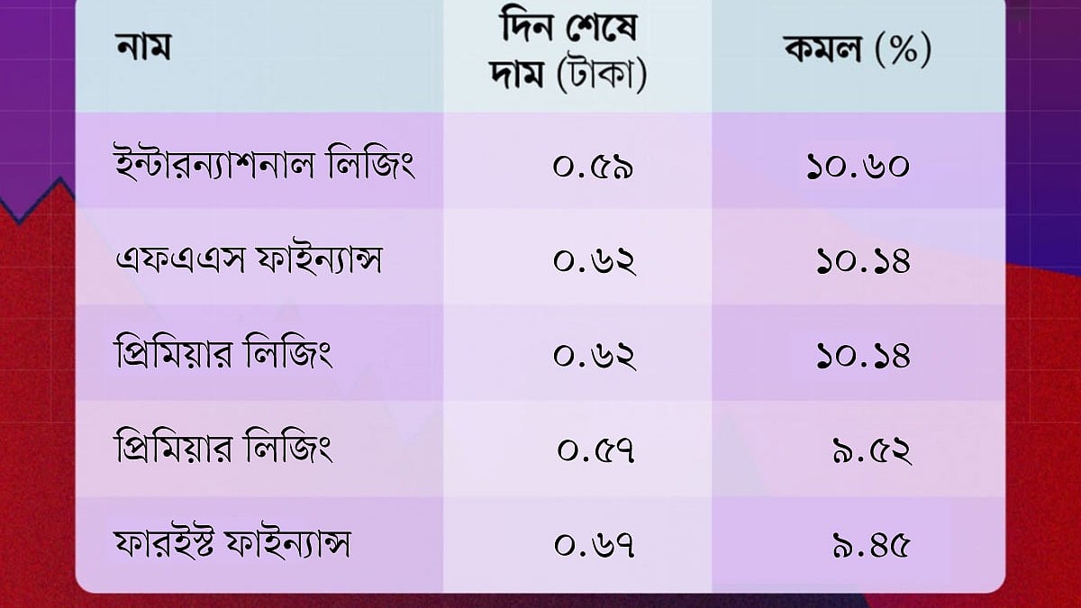 মূল্যহ্রাসের দিক থেকে আজও শীর্ষে আছে ইন্টারন্যাশনাল লিজিং। আজ এই শেয়ারের দাম কমেছে ১০ দশমিক ৬০ শতাংশ। গতকাল এই শেয়ারের দাম ছিল ৬৬ পয়সা। আজ দাম কমে হয়েছে ৫৯ পয়সা।