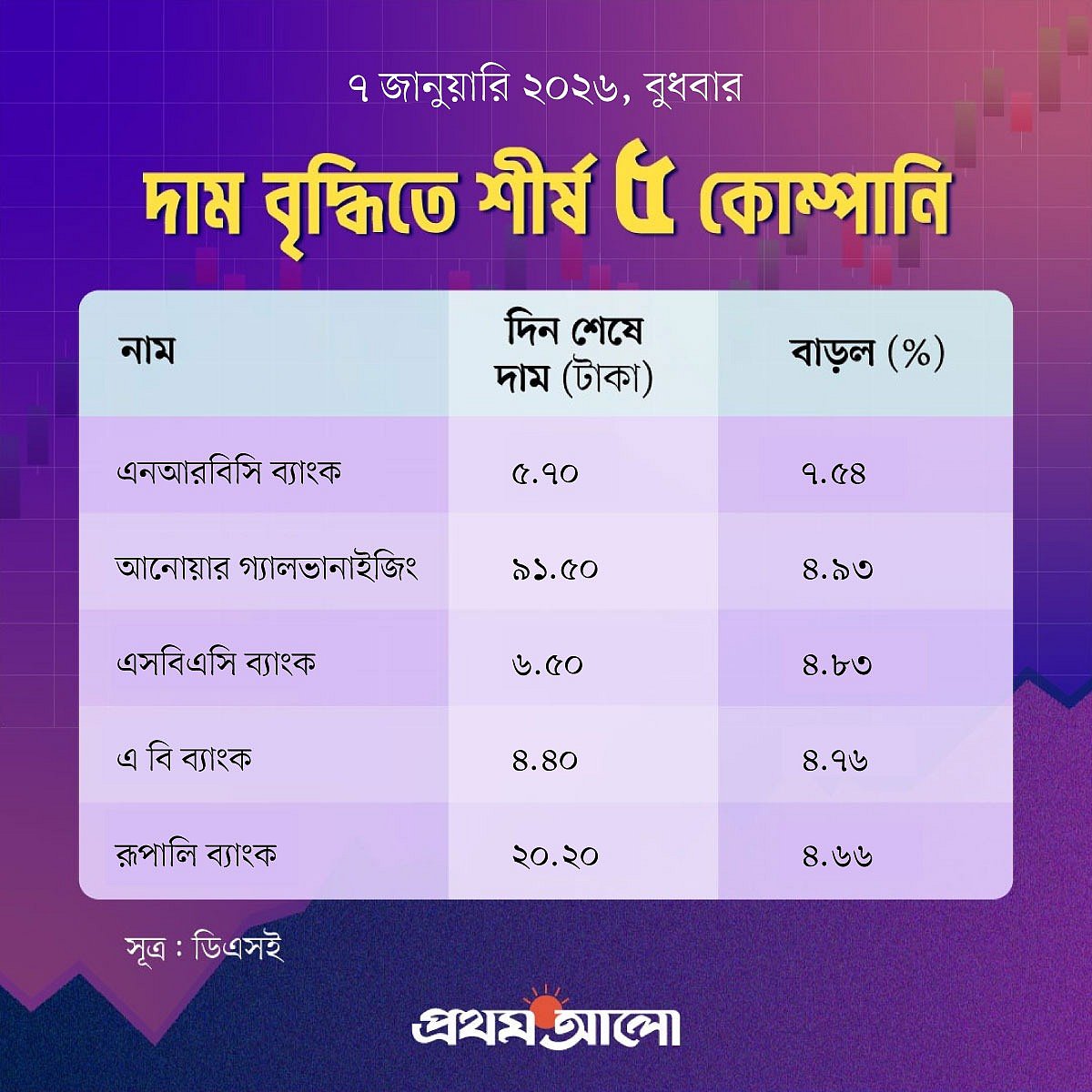 মূল্যবৃদ্ধির দিক থেকে আজ প্রথম স্থানে আছে এনআরবিসি ব্যাংক। গতকাল এই শেয়ারের দাম ছিল ৫ টাকা ৩০ পয়সা। আজ এই কোম্পানির শেয়ারের দাম বেড়ে হয়েছে ৫ টাকা ৭০ পয়সা। আজ দাম বেড়েছে ৭ দশমিক ৫৪ শতাংশ।