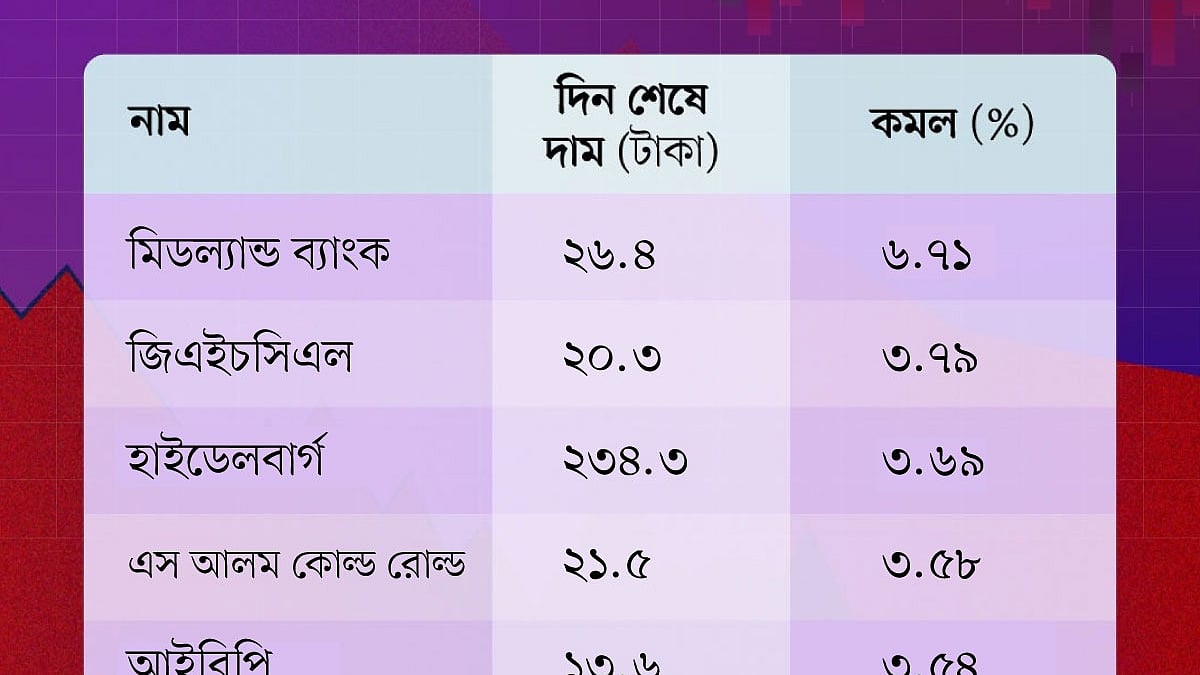 মূল্যহ্রাসের দিক থেকে আজ প্রথম স্থানে আছে মিডল্যান্ড ব্যাংক। আজ এই কোম্পানির শেয়ারের দাম কমেছে ৬ দশমিক ৭১ শতাংশ বা ১ দশমিক ৯ টাকা। গতকাল দিন শেষে এর দাম ছিল ২৮ দশমিক ৩ টাকা। আজ দাম কমে হয়েছে ২৬ দশমিক ৪ টাকা। কোম্পানিটি ২০২৩ সালে ৩ শতাংশ ও ২০২২ সালে ৫ শতাংশ নগদ লভ্যাংশ দিয়েছে।