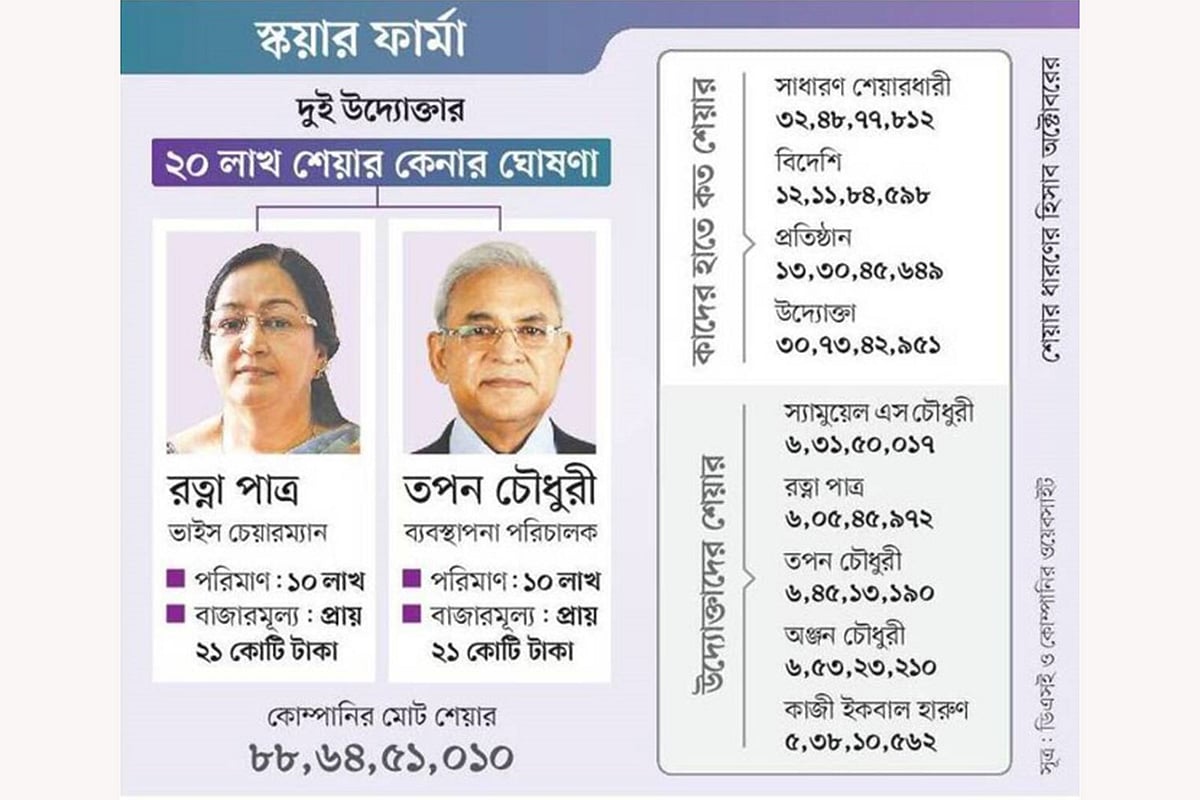 দেশের প্রধান শেয়ারবাজার ঢাকা স্টক এক্সচেঞ্জে (ডিএসই) গতকাল রোববার কোম্পানিটির শেয়ার কেনার এ ঘোষণা দেওয়া হয়। গতকাল শেয়ার কেনার যে ঘোষণা দেওয়া হয়েছে, তাতে বলা হয়েছে যে স্কয়ার ফার্মার দুই উদ্যোক্তা ১০ লাখ করে শেয়ার কিনবেন। বর্তমানে শেয়ারবাজারে স্কয়ার ফার্মার প্রতিটি শেয়ারের দাম ২০৯ টাকা ৮০ পয়সা। বর্তমান এ বাজারমূল্য অনুযায়ী, দুই উদ্যোক্তার কেনা ২০ লাখ শেয়ারের দাম পড়বে প্রায় ৪২ কোটি টাকা।