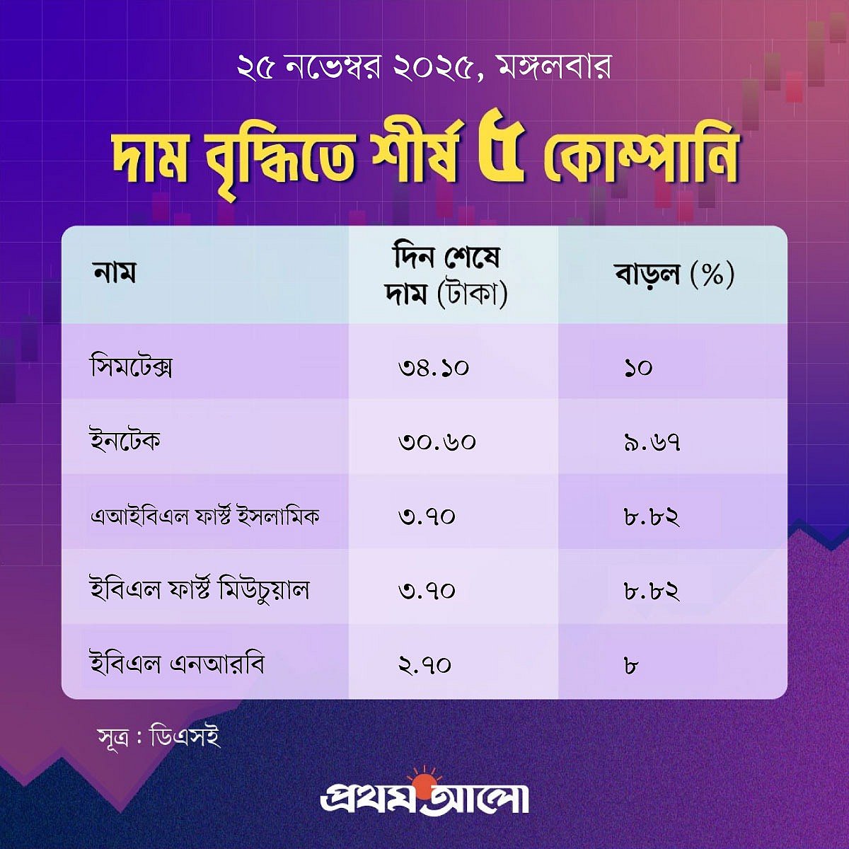 মূল্যবৃদ্ধির দিক থেকে আজও প্রথম স্থানে আছে সিমটেক্স। গতকাল এই শেয়ারের দাম ছিল ৩১ টাকা। আজ এই কোম্পানির শেয়ারের দাম বেড়ে হয়েছে ৩৪ টাকা ১০ পয়সা। আজ দাম বেড়েছে ১০ শতাংশ।