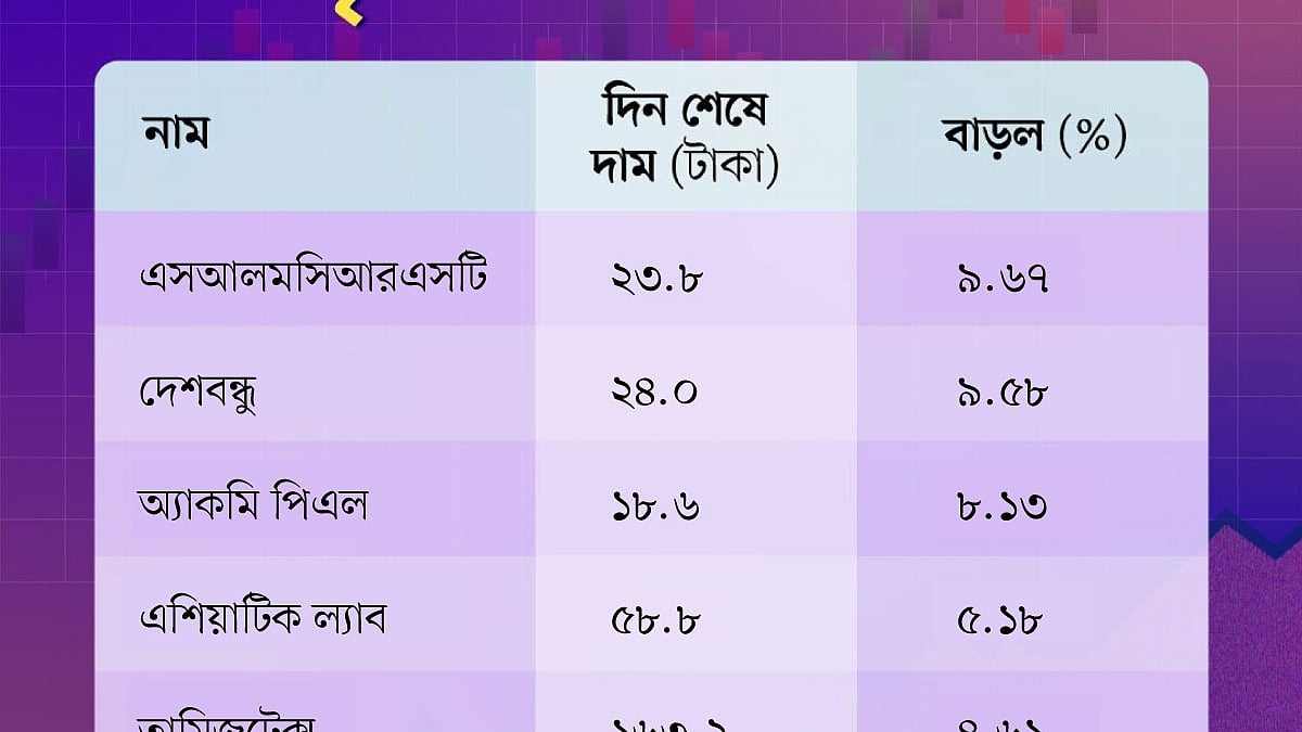 মূল্যবৃদ্ধির দিক থেকে আজ চতুর্থ স্থানে আছে এশিয়াটিক ল্যাব। আজ এই শেয়ারের দাম বেড়েছে ৫ দশমিক ১৮ শতাংশ বা ২ দশমিক ৯ টাকা। বৃহস্পতিবার দিন শেষে এই কোম্পানির শেয়ারের দাম ছিল ৫৫ দশমিক ৯০ টাকা। আজ দিন শেষে দাম বেড়ে হয়েছে ৫৮ দশমিক ৮০ টাকা।