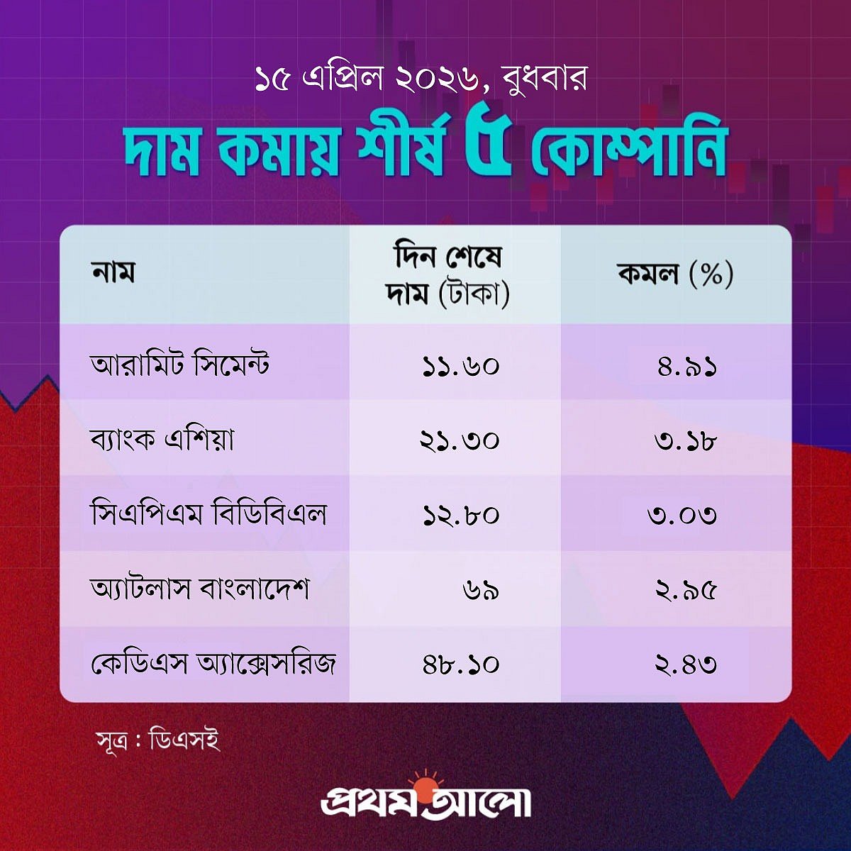 আজ দিন শেষে দাম বেড়েছে ২৩৯টি কোম্পানির শেয়ারের। কমেছে ৯০টির ও অপরিবর্তিত আছে ৬৪টি কোম্পানির শেয়ারের দাম। দেখে নেওয়া যাক, আজ মূল্যহ্রাসের শীর্ষে আছে কোন কোম্পানিগুলো।