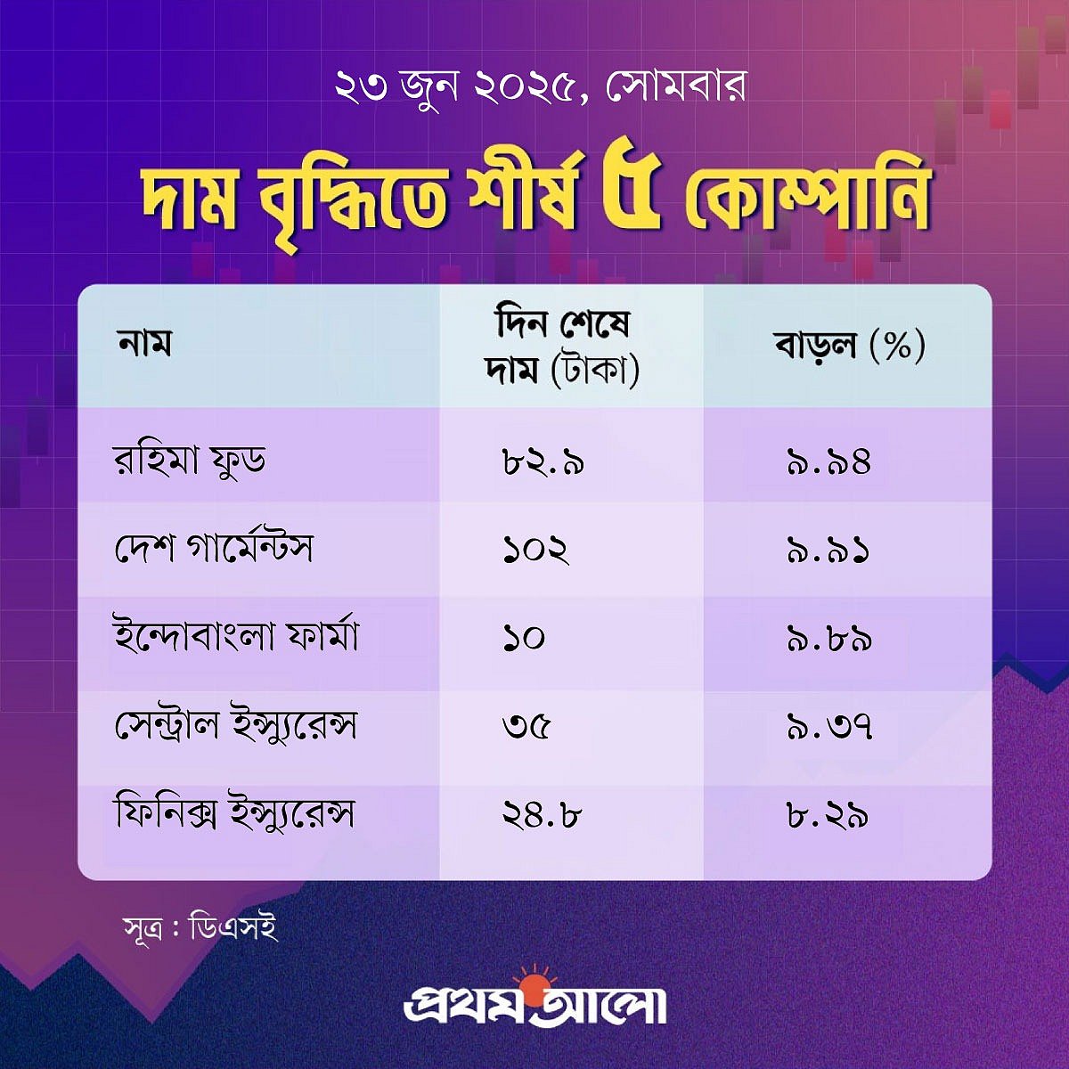 মূল্যবৃদ্ধির দিক থেকে আজ প্রথম স্থানে আছে রহিমা ফুড করপোরেশন লিমিটেড। এই কোম্পানির শেয়ারের দাম আজ বেড়েছে ৯ দশমিক ৯৪ শতাংশ। গতকাল রোববার দিন শেষে এই কোম্পানির শেয়ারের দাম ছিল ৭৫ দশমিক ৪ টাকা। আজ লেনদেন শেষে কোম্পানিটির শেয়ারের দাম হয়েছে ৮২ দশমিক ৯ টাকা। কোম্পানিটি ২০২৪ ও ২০২৩ সালে ১০ শতাংশ নগদ লভ্যাংশ দিয়েছে।