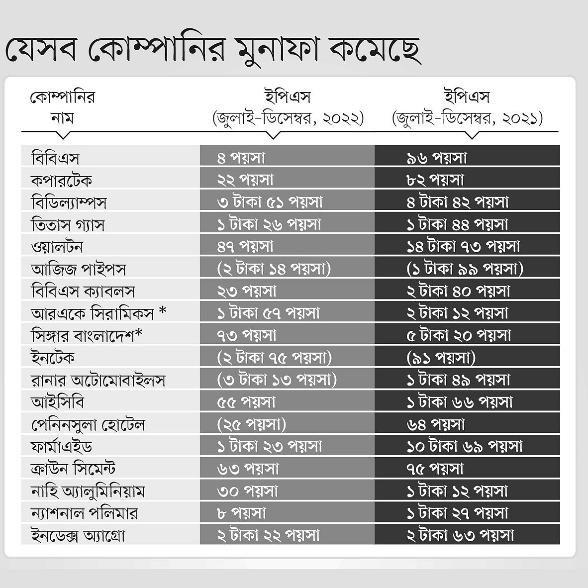 শেয়ারের দামের ওঠানামা শেয়ারবাজারে তালিকাভুক্ত কোম্পানিগুলোর মুনাফায় বড় ভূমিকা রাখে। সে অনুযায়ী যে কোম্পানি যত বেশি মুনাফা করবে, সেটির শেয়ারের দামও তত বাড়বে। এটিই শেয়ারবাজারের স্বাভাবিক প্রবণতা। তবে কখনো কখনো এর ব্যতিক্রমও ঘটে। কিন্তু স্বাভাবিক প্রবণতাকে বিবেচনায় নিলে বলা যায়, গত ডিসেম্বর শেষে তালিকাভুক্ত কোম্পানিগুলো লাভ-লোকসানের যে হিসাব দিচ্ছে, তা শেয়ারবাজারের জন্য মোটেও সুখকর নয়।