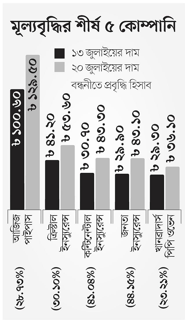 আলোচ্য সপ্তাহে শেয়ারবাজারে মূল্যবৃদ্ধিতে শীর্ষ ১০ কোম্পানির বেশির ভাগেরই দাম বেড়েছে সুনির্দিষ্ট কোনো কারণ ছাড়াই। এ মূল্যবৃদ্ধির কোনো কারণও জানা নেই কোম্পানিগুলোর। বাজারসংশ্লিষ্ট ব্যক্তিরা বলছেন, নানা ধরনের গুজব ছড়িয়ে কিছু কিছু কোম্পানির শেয়ারের অস্বাভাবিক মূল্যবৃদ্ধি ঘটানো হচ্ছে।