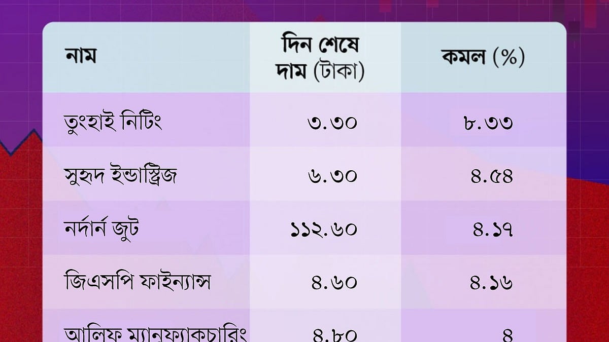 আজ দিন শেষে দাম বেড়েছে ১৮৮টি কোম্পানির শেয়ারের। কমেছে ১৪৫টির ও অপরিবর্তিত আছে ৬৬টি কোম্পানির শেয়ারের দাম। দেখে নেওয়া যাক, আজ মূল্যহ্রাসের শীর্ষে আছে কোন কোম্পানিগুলো।