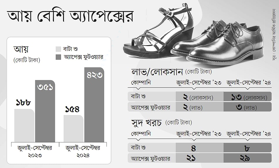 শেয়ারবাজারে তালিকাভুক্ত কোম্পানি দুটির আর্থিক প্রতিবেদন বিশ্লেষণ করে এমন তথ্য পাওয়া গেছে। বাটা শু গত ৩১ অক্টোবর চলতি অর্থবছরের প্রথম প্রান্তিকের আর্থিক প্রতিবেদন প্রকাশ করেছে। আর অ্যাপেক্স ফুটওয়্যার একই প্রান্তিকের আর্থিক প্রতিবেদন প্রকাশ করেছে গতকাল বুধবার।