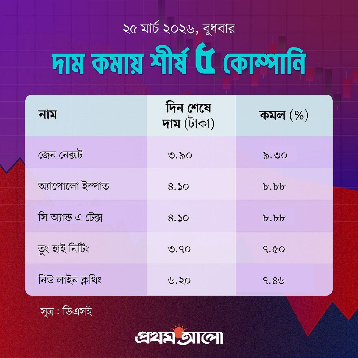 মূল্যহ্রাসের দিক থেকে আজ প্রথম স্থানে আছে জেন নেক্সট। গত কার্যদিবসে এই শেয়ারের দাম ছিল ৪ টাকা ৩০ পয়সা। আজ এই কোম্পানির শেয়ারের দাম কমে হয়েছে ৩ টাকা ৯০ পয়সা। আজ দাম কমেছে ৯ দশমিক ৩০ শতাংশ।