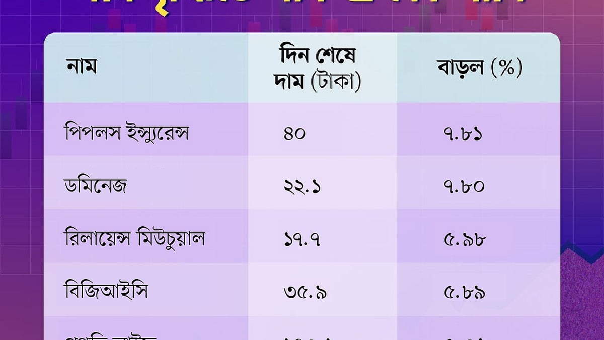 মূল্যবৃদ্ধির দিক থেকে গতকালের মতো আজও প্রথম স্থানে আছে পিপলস ইনস্যুরেন্স। গতকাল এই কোম্পানির শেয়ারের দাম ছিল ৩৭ দশমিক ১০ টাকা। আজ দাম বেড়ে হয়েছে ৪০ টাকা। অর্থাৎ দাম বেড়েছে ৭ দশমিক ৮১ শতাংশ।