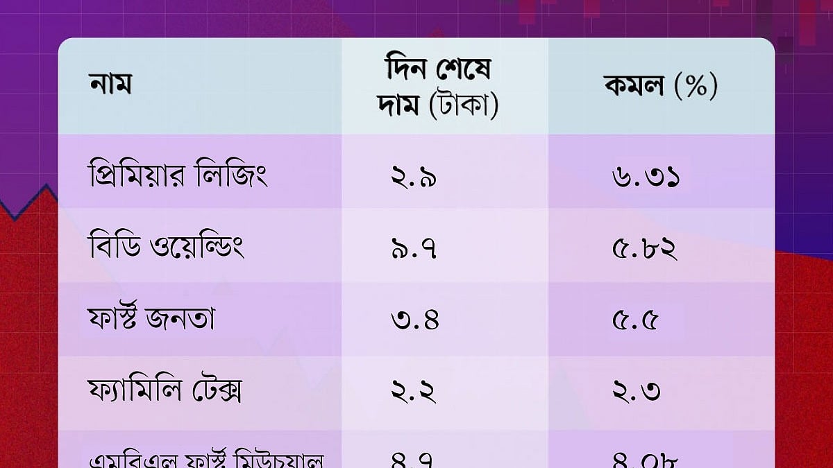 আজ মঙ্গলবার চলতি সপ্তাহের দ্বিতীয় কার্যদিবস। শেয়ারবাজারের লেনদেন শেষ হয়েছে। আজ দিন শেষে ঢাকার শেয়ারবাজারের তিনটি সূচকই ছিল ঊর্ধ্বমুখী। আজ লেনদেন ৬০০ কোটি টাকা অতিক্রম করেছে। মূল্যহ্রাসের দিক থেকে প্রথম স্থানে আছে প্রিমিয়ার লিজিং। সূত্র ঢাকা স্টক এক্সচেঞ্জ।