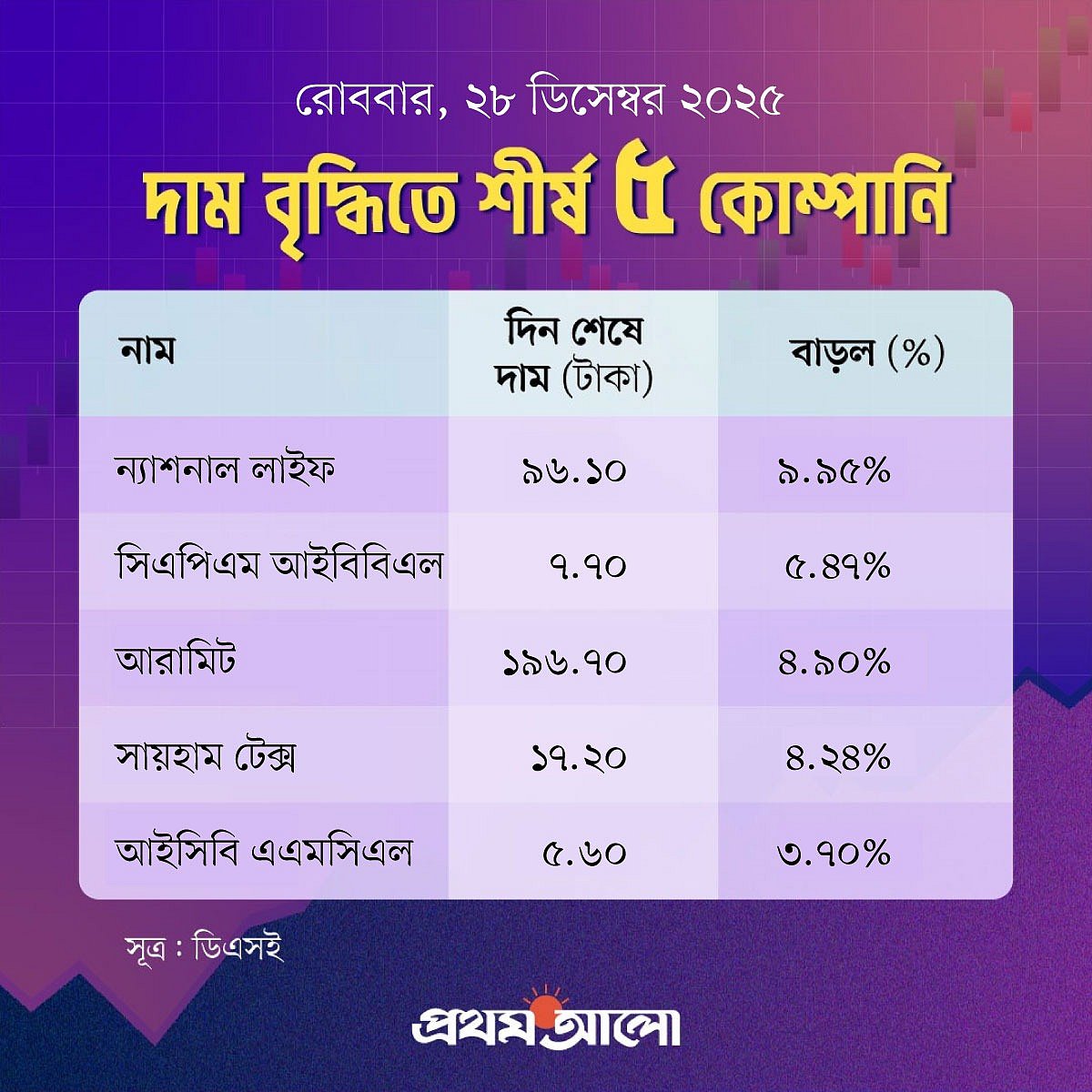মূল্যবৃদ্ধির দিক থেকে আজ প্রথম স্থানে আছে ন্যাশনাল লাইফ ইন্স্যুরেন্স। গত বৃহস্পতিবার এই শেয়ারের দাম ছিল ৮৭ টাকা ৪০ পয়সা। আজ এই কোম্পানির শেয়ারের দাম বেড়ে হয়েছে ৯৬ টাকা ১০ পয়সা। আজ দাম বেড়েছে ৯ দশমিক ৯৫ শতাংশ।