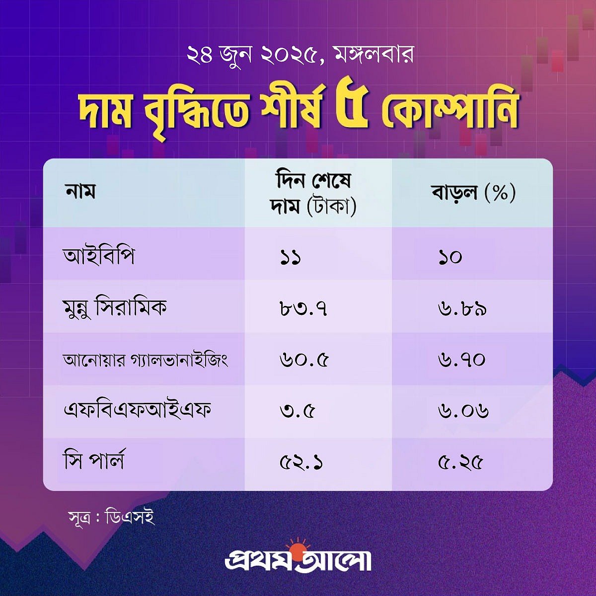 চতুর্থ স্থানে আছে ফার্স্ট বাংলাদেশ ফিক্সড ইনকাম ফান্ড। আজ এই কোম্পানির শেয়ারের দাম বেড়েছে ৬ দশমিক ৬ শতাংশ। গতকাল দিন শেষে এর দাম ছিল ৩ দশমিক ৩ টাকা। আজ দিন শেষে দাম হয়েছে ৩ দশমিক ৫ টাকা। কোম্পানিটি ২০২৩ সালে ৫ শতাংশ ও ২০২২ সালে ৬ শতাংশ নগদ লভ্যাংশ দিয়েছে।