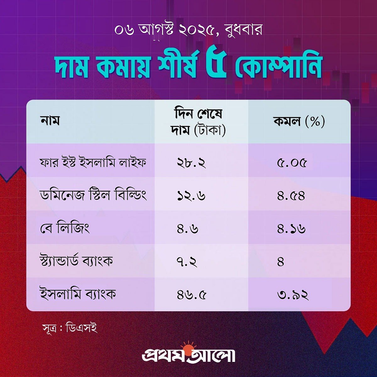 চতুর্থ স্থানে আছে স্ট্যান্ডার্ড ব্যাংক। আজ এই কোম্পানির শেয়ারের দাম কমেছে ৪ শতাংশ বা ৫০ পয়সা। সোমবার দিন শেষে এই কোম্পানির শেয়ারের দাম ছিল ৭ দশমিক ৫ টাকা। আজ দিন শেষে দাম হয়েছে ৭ দশমিক ২ টাকা।