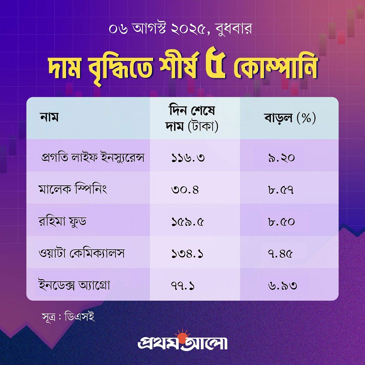 আজ দাম বেড়েছে ১৫৪টি কোম্পানির শেয়ারের। দাম কমেছে ১৮৪টি কোম্পানির শেয়ারের। সেই সঙ্গে অপরিবর্তিত আছে ৬২টি কোম্পানির শেয়ার। ঢাকা স্টক এক্সচেঞ্জের (ডিএসই) তথ্য অনুসারে, আজ ঢাকার শেয়ারবাজারে মূল্যবৃদ্ধির শীর্ষে আছে প্রগতি লাইফ ইনস্যুরেন্স।