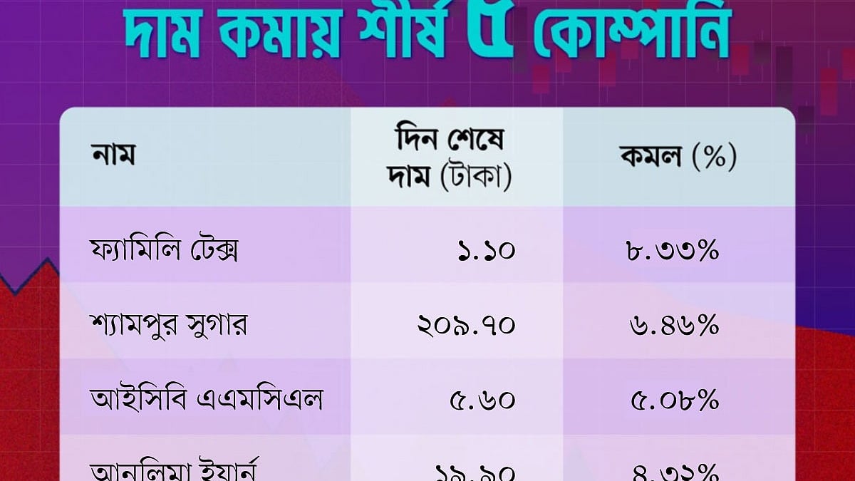 আজ দিন শেষে দাম বেড়েছে ১১৪টি কোম্পানির শেয়ারের। কমেছে ২২৭টির ও অপরিবর্তিত আছে ৫৩টি কোম্পানির। ঢাকা স্টক এক্সচেঞ্জের ওয়েবসাইটের তথ্য অনুসারে, আজ মূল্যহ্রাসের শীর্ষে আছে ফ্যামিলি টেক্স।