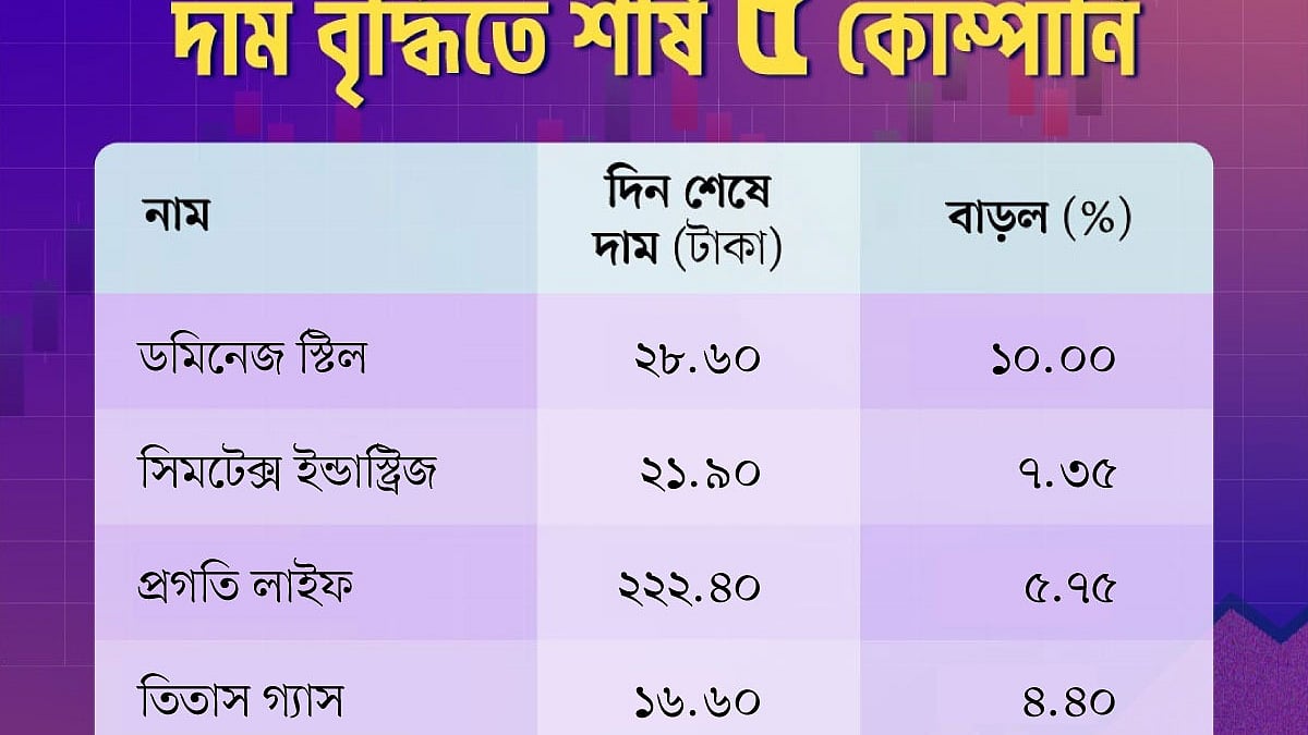 মূল্যবৃদ্ধির দিক থেকে আজ প্রথম স্থানে আছে ডমিনেজ স্টিল। গতকাল এই শেয়ারের দাম ছিল ২৬ টাকা। আজ এই কোম্পানির শেয়ারের দাম বেড়ে হয়েছে ২৮ টাকা ৬০ পয়সা। আজ দাম বেড়েছে ১০ শতাংশ।