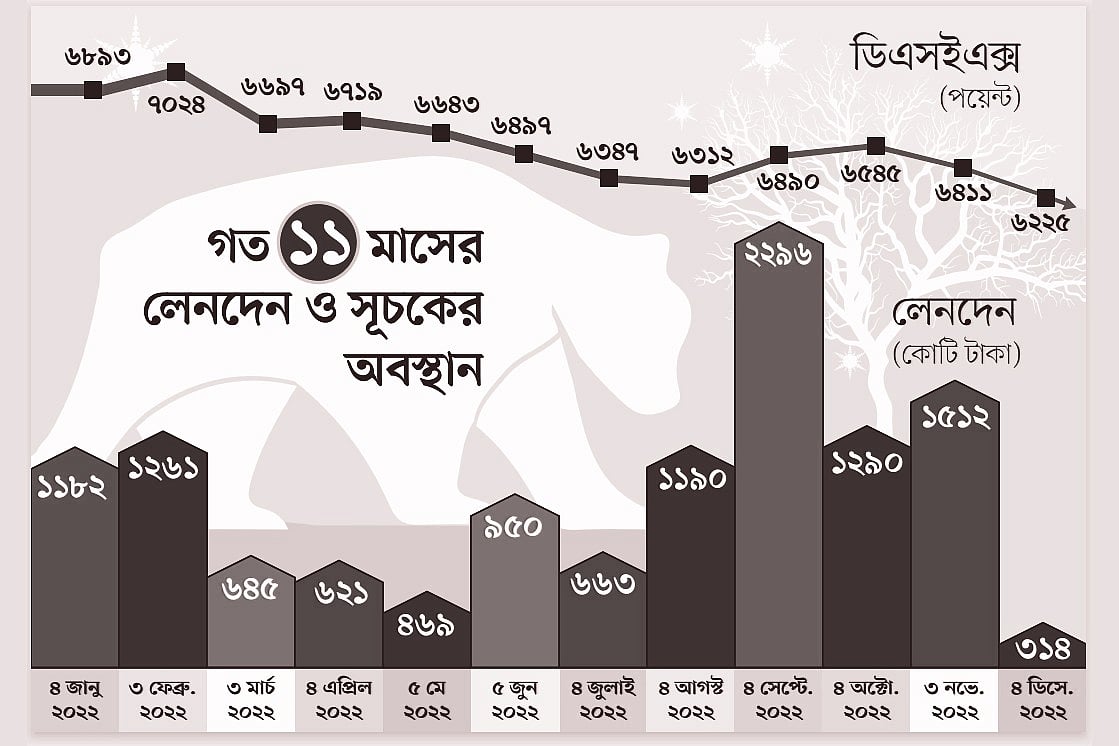 গতকাল রোববার ডিএসইতে লেনদেন নেমেছে ৩১৪ কোটি টাকা, যা গত ২০ মাসের মধ্যে সর্বনিম্ন। এর আগে গত বছরের ৫ মে ডিএসইতে সর্বনিম্ন ২৩৭ কোটি টাকার লেনদেন হয়েছিল। লেনদেনের পাশাপাশি গতকাল সূচকও কমেছে। ডিএসইর প্রধান সূচক ডিএসইএক্স এদিন ২১ পয়েন্ট কমে ৬ হাজার ২২৫ পয়েন্টে নেমেছে।