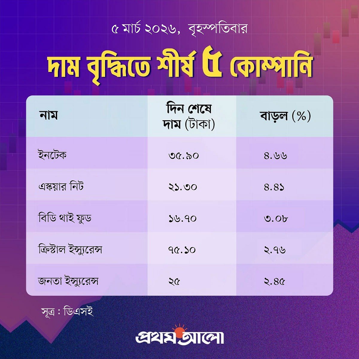 মূল্যবৃদ্ধির দিক থেকে আজ পঞ্চম স্থানে আছে জনতা ইনস্যুরেন্স। আজ এই শেয়ারের দাম বেড়েছে ২ দশমিক ৪৫ শতাংশ। গত কার্যদিবসে এর দাম ছিল ২৪ টাকা ৪০ পয়সা। আজ দাম বেড়ে হয়েছে ২৫ টাকা।