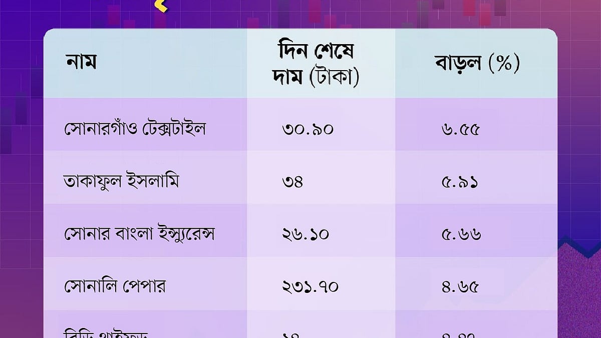 মূল্যবৃদ্ধির দিক থেকে আজ প্রথম স্থানে আছে সোনারগাঁও টেক্সটাইল। গতকাল এই শেয়ারের দাম ছিল ২৯ টাকা। আজ এই কোম্পানির শেয়ারের দাম বেড়ে হয়েছে ৩০ টাকা ৯০ পয়সা। আজ দাম বেড়েছে ৬ দশমিক ৫৫ শতাংশ।